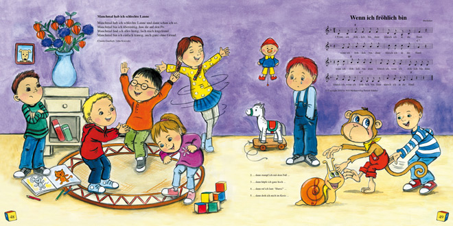 Im Buch finden sich 25 Themen aus der Welt der Klein- und Kindergartenkinder, liebevoll illustriert, mit jeweils einem Lied und passendem Gedicht, Finger- oder Bewegungsspiel. Auf jeder Seite ist Platz, um mit den Kindern und (Groß-)Eltern im Unterricht zu basteln - Sticker, Fotos, Ferdern, Spiegelfolie etc. einzukleben. So wird für jedes Kind das eigene gestaltete Buch zu etwas ganz Besonderem.
