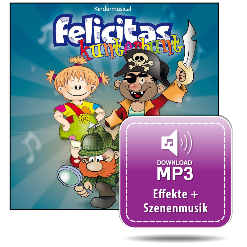 Dieses Downloadprodukt enthält alle Effekte und Szenenmusiken zum Kindermusical Felicitas Kunterbunt als MP3 Format, so wie sie im Technikskript verwendet werden.