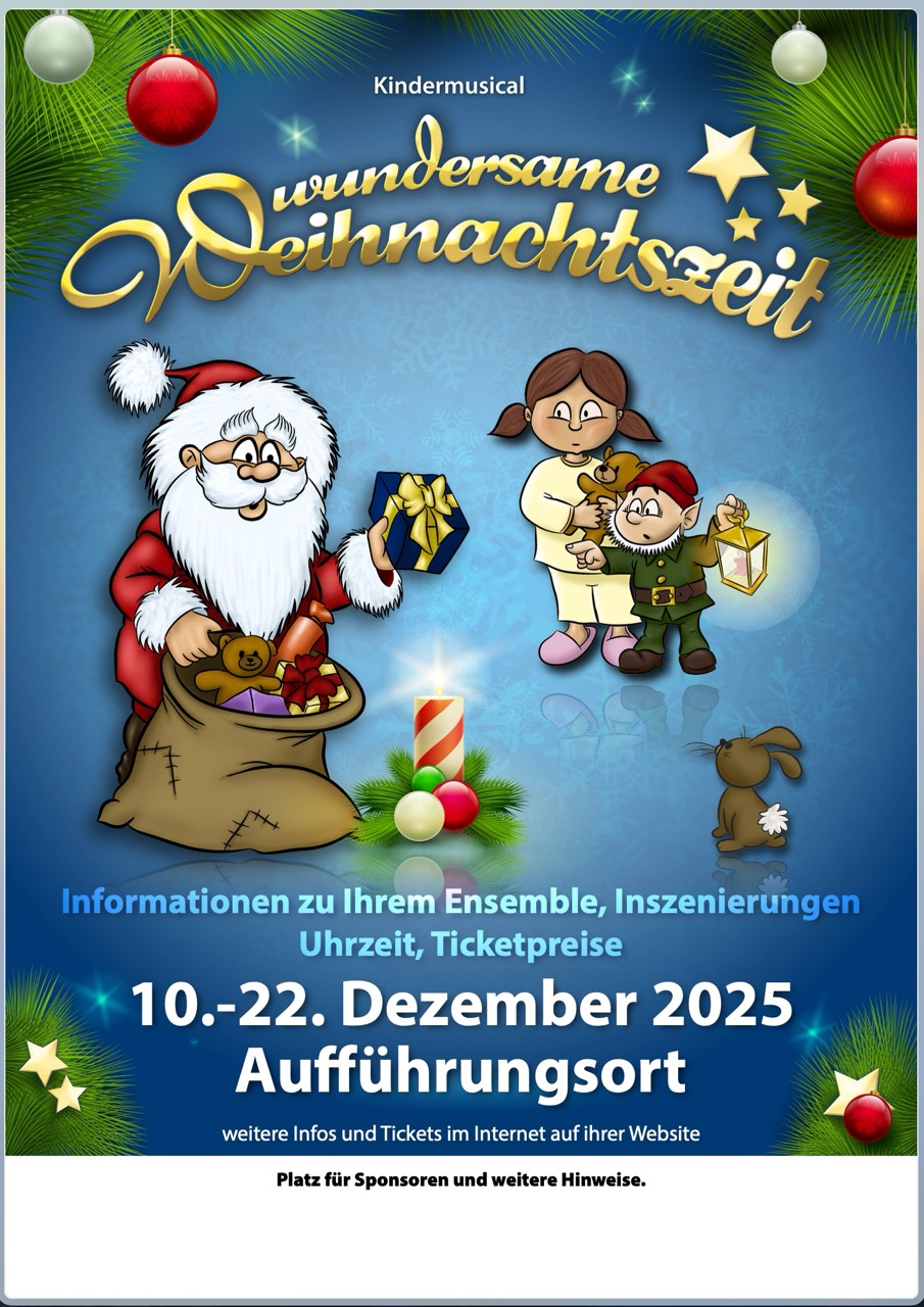 Mit dieser professionell gestalteten Plakatvorlage kann jeder ganz einfach sein individuelles Plakat für die eigene Aufführung von Wundersame Weihnachtszeit gestalten – ohne Grafikkenntnisse!